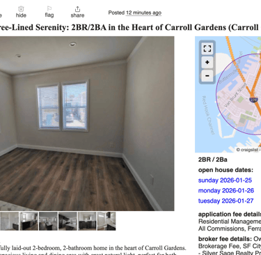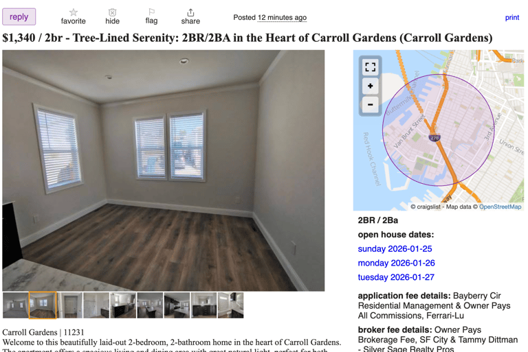 This post is on Craigslist, so I'm already taking a risk. The price is wildly low. Typical agents don't use words like "Tree-Lined Serenity." I googled the brokerage information and there's no clear evidence online that it's real. The post finishes with the instructions: "Kindly send your contact number for further discussion." Unlike with Street Easy listings, I can't see any address, so I can't search the location, either. This is clearly a scam.